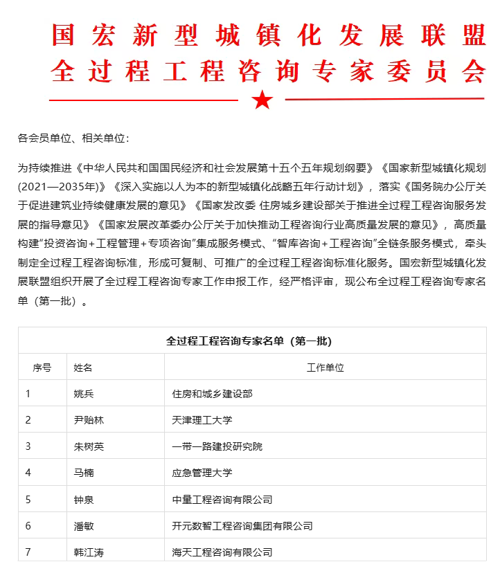 近日,国宏新型城镇化发展联盟公布首批全过程工程咨询专家名单,经严格评审与筛选,我司总经理王春生凭借深厚的专业素养、丰富的项目实践经验与行业影响力,成功入选本次专家库。